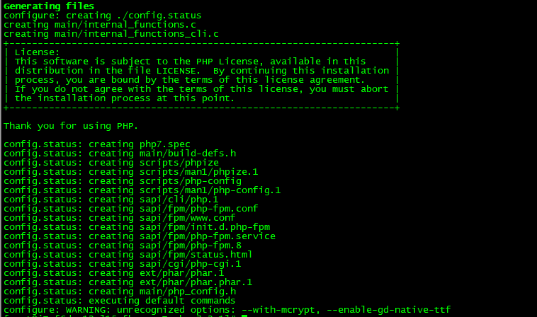./configure \ --prefix=/usr/local/php7 \ --exec-prefix=/usr/local/php7 \ --with-config-file-path=/usr/local/php7/etc \ --with-curl \ --with-freetype-dir \ --with-gd \ --with-gettext \ --with-iconv-dir \ --with-kerberos \ --with-libdir=lib64 \ --with-libxml-dir \ --with-mysqli \ --with-openssl \ --with-pcre-regex \ --with-pdo-mysql \ --with-pdo-sqlite \ --with-pear \ --with-png-dir \ --with-xmlrpc \ --with-xsl \ --with-zlib \ --with-zlib-dir \ --with-mhash \ --with-mcrypt \ --with-openssl-dir \ --with-jpeg-dir \ --enable-gd-jis-conv \ --enable-fpm \ --enable-bcmath \ --enable-libxml \ --enable-inline-optimization \ --enable-gd-native-ttf \ --enable-mbregex \ --enable-mbstring \ --enable-opcache \ --enable-pcntl \ --enable-shmop \ --enable-soap \ --enable-sockets \ --enable-sysvsem \ --enable-xml \ --enable-zip
